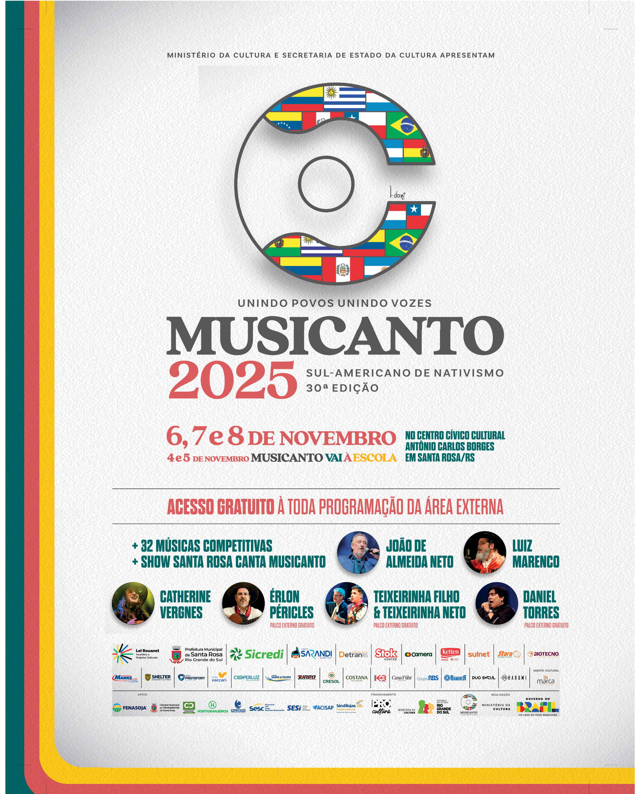 novembro 6 @ 17:30 - novembro 8 @ 22:30 Musicanto 2025 Centro Cívico Cultural Antônio Carlos Borges Rua Buenos Aires, 937, Santa Rosa, Rio Grande do Sul, Brazil