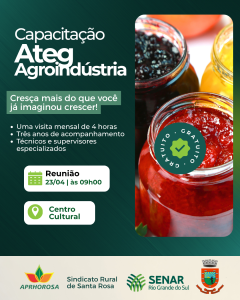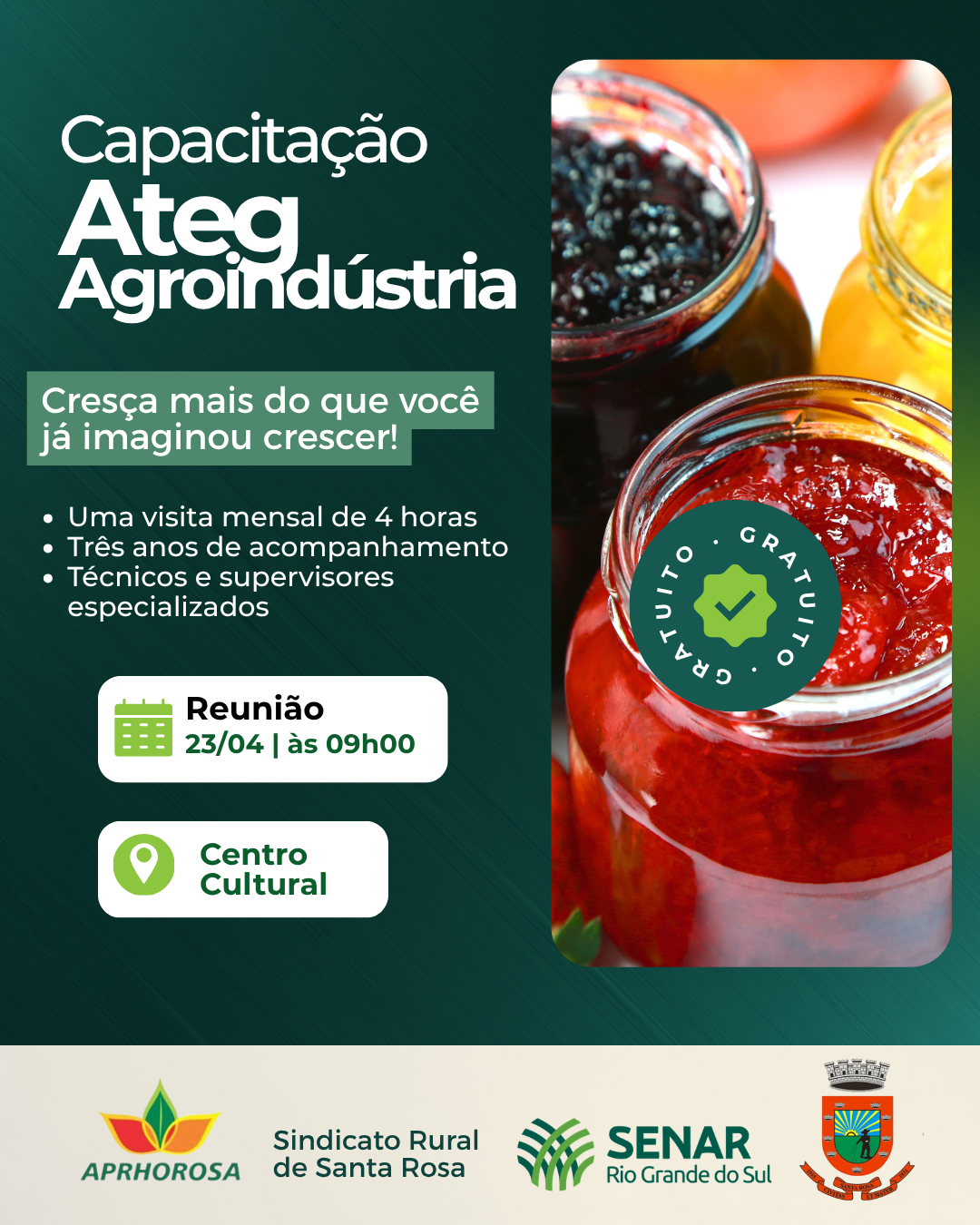 A Secretaria Municipal de Agricultura de Santa Rosa, em parceria com o Senar e o Sindicato Rural, anuncia a implementação do projeto ATeG Agroindústria. A iniciativa conta com o apoio da Aprhorosa e busca fortalecer pequenos empreendimentos na região. O programa oferece assistência técnica e gerencial gratuita durante o período de três anos para os participantes. As atividades são desenvolvidas diretamente em cada unidade por meio de visitas mensais com quatro horas de duração.