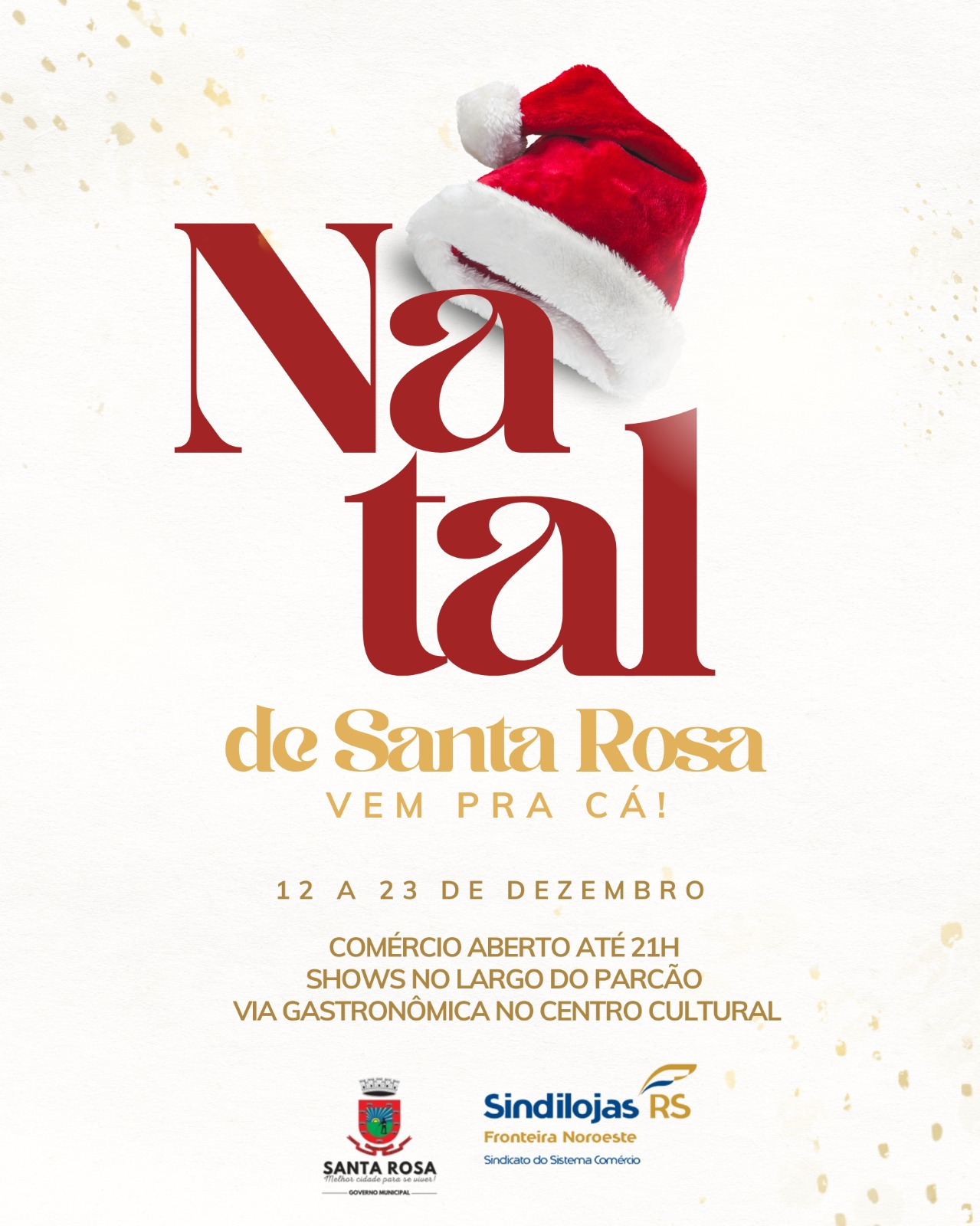 Natal Santa Rosa! Vem para cá! Nossa cidade vai estar com o comércio preparado para te receber! Além disso, a partir do dia 12 de dezembro, teremos uma programação intensa! Natal Santa Rosa! Vem pra cá!