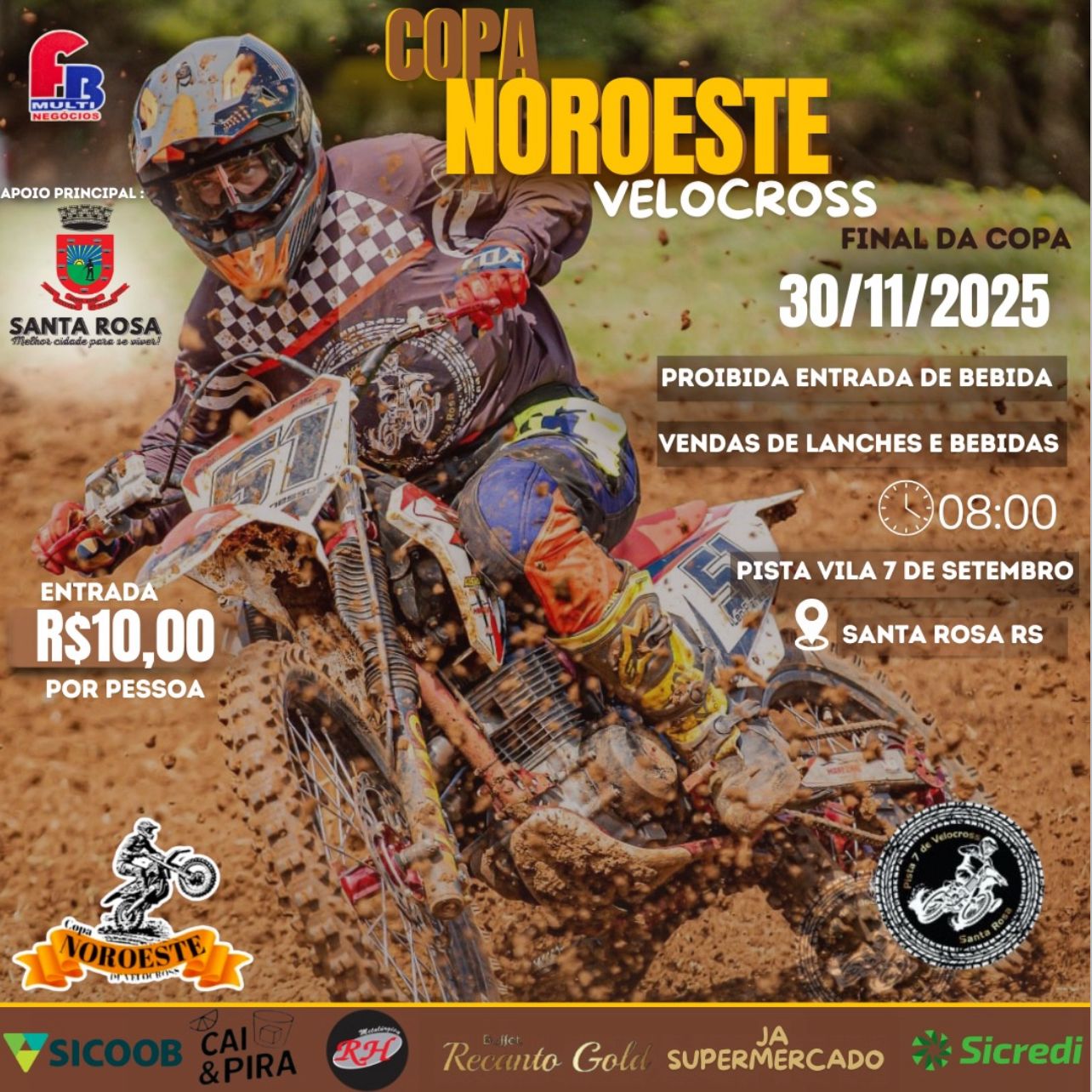 FINAL DA COPA NOROESTE 📍 Pista 7 (Vila 7 de Setembro) – Santa Rosa/RS 🎟️ ENTRADA R$ 10,00 por pessoa 🗓️ Anote na sua agenda: 30 de Novembro de 2025 🍔🥤 Lanches e Bebidas à venda no local!!! ⚠️ PROIBIDA A ENTRADA DE BEBIDAS ⚠️ 🚀 Realização: FB Multi Negócios 📌Apoio Principal:Prefeitura Municipal Santa Rosa RS
